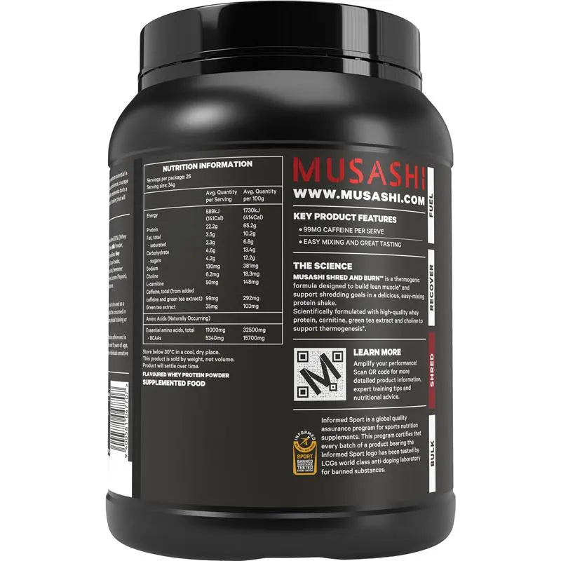MUSASHI SHRED AND BURN is an optimised protein powder providing a powerful blend of active ingredients designed to support lean muscle goals. MUSASHI SHRED AND BURN is scientifically formulated using Whey protein Concentrate and Whey Protein Isolate in an advanced muscle shredding complex. This lean muscle formula is enhanced with key SHRED AND BURN ingredients: L-carnitine and Green Tea extract to support your goals in a delicious formula that tastes great and mixes with ease. Features PROTEIN TO BUILD LEAN MUSCLE THERMOGENIC COMPLEX HIGH POTENCY GREEN TEA EXTRACT P22g | C4g | F3g