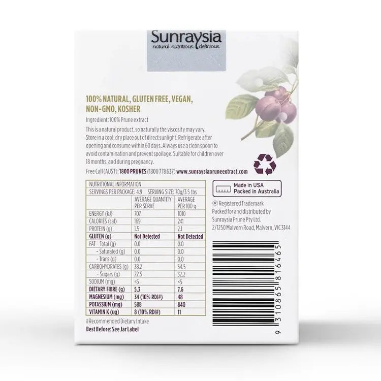 Each jar of Sunraysia Prune Extract is made with 100% premium-quality Californian Prunes. More than 70 large Prunes are packed into each jar - giving you the best of the best. It's the natural, delicious way to get regular and stay regular.